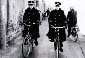 The sound world of On the Beat, too, reflects the new culture: the film's soundtrack is largely the background noise of TV (constantly on in the police station), usually a barely audible American cop show (Hunter, in fact, with big guns a-blazing), offering its counterpoint to the scenes we're watching.